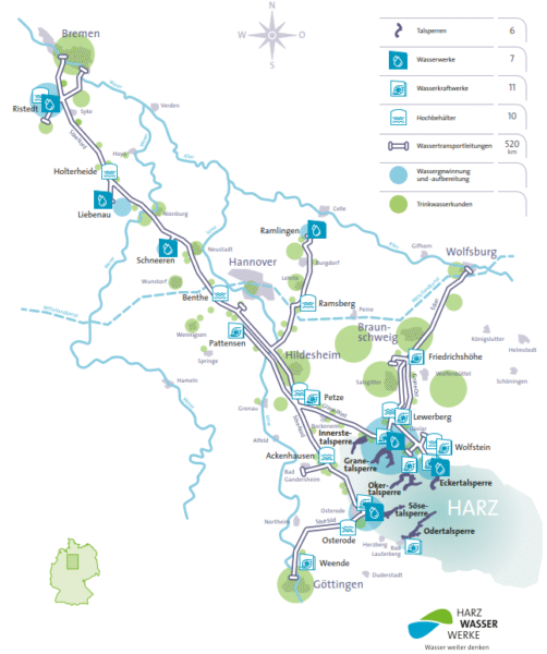 Als Vorversorger beliefern wir rund 70 Städte, Gemeinden und Wasserverbände im geographischen Dreieck Göttingen-Wolfsburg-Bremen, die anschließend den Transport des Trinkwassers bis zum Verbraucher übernehmen. Von unserem Hauptsitz in Hildesheim aus und an 20 weiteren Standorten in Niedersachsen leisten rund 280 Mitarbeiter tagtäglich alles dafür, dass nur bestes, weiches Wasser durch unser über 520 Kilometer langes Verbundsystem fließt. Weite Teile Niedersachsens und Bremen erhalten so qualitativ hochwertiges, weiches Trinkwasser, das zum größten Teil aus den Talsperren im Harz stammt und in unseren Wasserwerken aufbereitet wird.