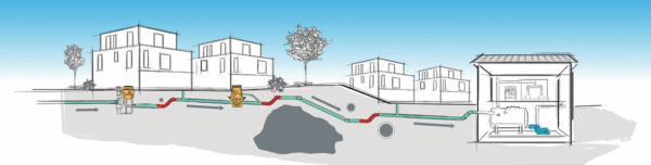 - Flexibilität: Die Führung der Rohrleitungen kann sehr flexibel an örtliche Gegebenheiten angepasst werden. Unter anderem lässt sich Abwasser bis zu 7 Meter vertikal nach oben transportieren – ein klarer Vorteil bei anspruchsvollen topografischen Bedingungen.