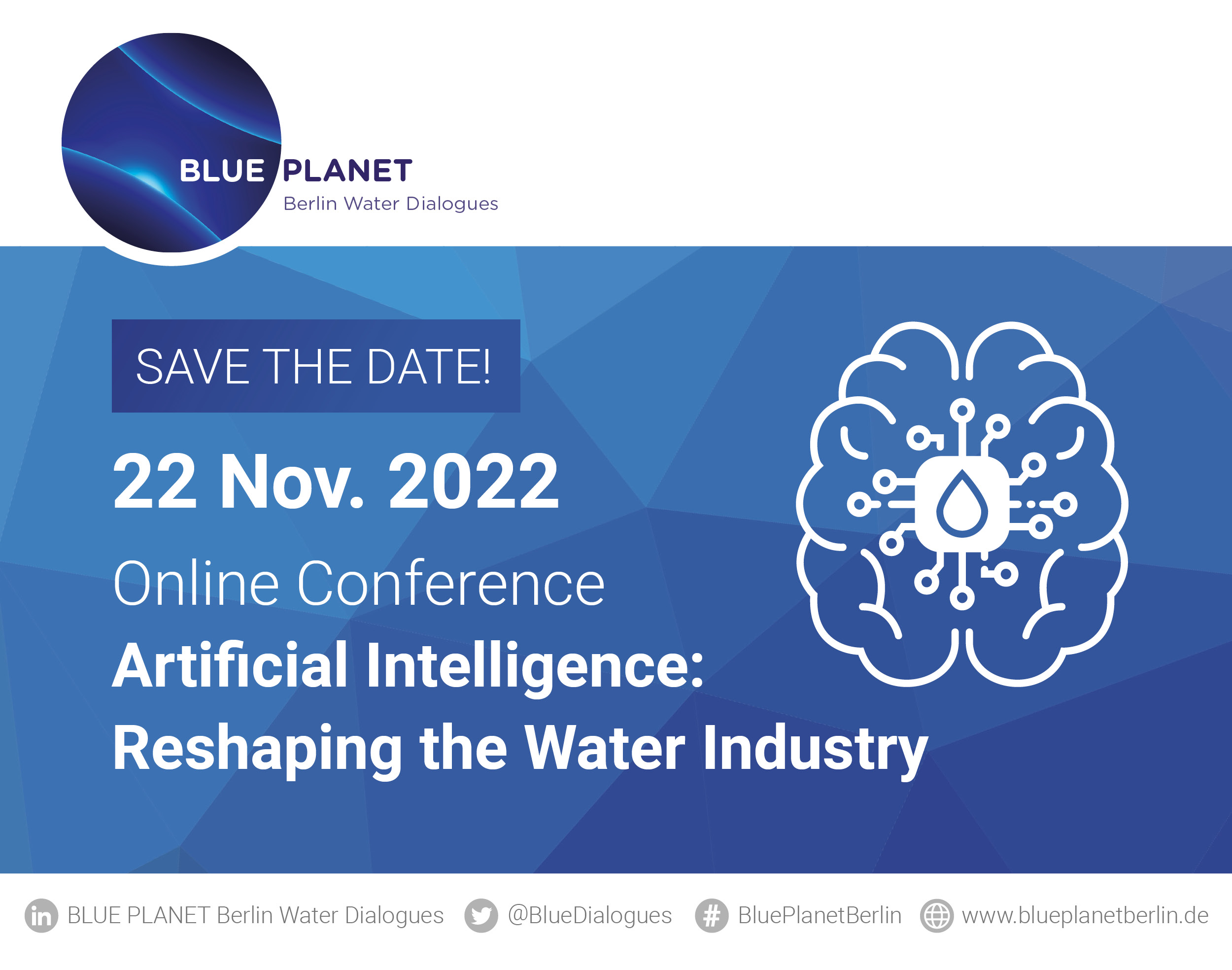 Die BLUE PLANET Berlin Water Dialogues sind die globale Netzwerk-Plattform, die internationale InteressenvertreterInnen und Stakeholder aus Forschung, Wirtschaft und Politik im Bereich des innovativen Wassermanagements zusammenbringt. Die Online-Konferenz bietet ein Forum, Lösungsansätze für zukunftsorientiertes und nachhaltiges Wasserressourcenmanagement im Hinblick auf die wachsenden globalen Herausforderungen durch den Klimawandel zu diskutieren. Die diesjährige Ausgabe am 22. November legt daher den Fokus auf die Potenziale und Herausforderungen bei der Anwendung von KI im Wassersektor. Zudem werden internationale Best-Practice-Beispiele der Branche beleuchtet.