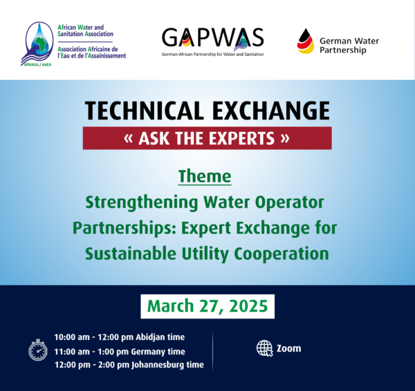 “Ask the Experts” is a series of events within the framework of the German-African Partnership for Water and Sanitation (GAPWAS), our partnership project with the African Water and Sanitation Association (AfWASA) in Abidjan, Côte d’Ivoire. The concept aims at promoting technical exchange between German and African experts in the water and sanitation sector while addressing specific challenges faced by members of both associations.