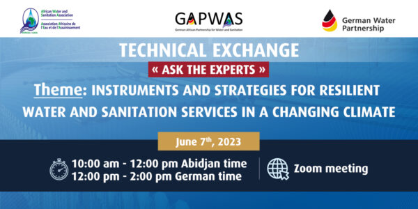 „Ask the Experts“ ist eine Veranstaltungsreihe im Rahmen der German-African Partnership for Water and Sanitation (GAPWAS), unserem Partnerschaftsprojekt mit der African Water and Sanitation Association (AfWASA) in Abidjan, Côte d’Ivoire. Das Konzept zielt darauf ab, den Fachaustausch zwischen deutschen und afrikanischen ExpertInnen aus dem Wasser- und Abwasserbereich zu fördern und gleichzeitig spezifische Herausforderungen anzusprechen, mit denen die Mitglieder beider Verbände konfrontiert sind.