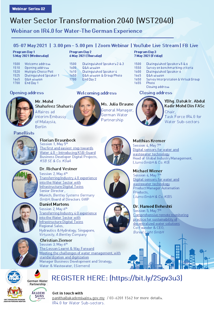 Happening on Wednesday, 5-7 May 2021 at 3.00 PM is a webinar on IR4.0 for Water Sub-Sectors- The German Experience commemorating the Water Sector Transformation 2040 agenda for Malaysia. All are welcome to join the German Water experts and distinguished speakers.